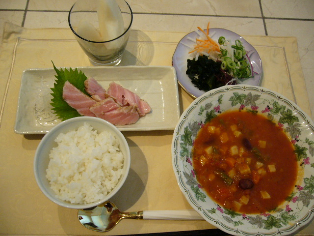 野菜たっぷりのミネストローネ。そしてデザートにはこれまた大好物の梨