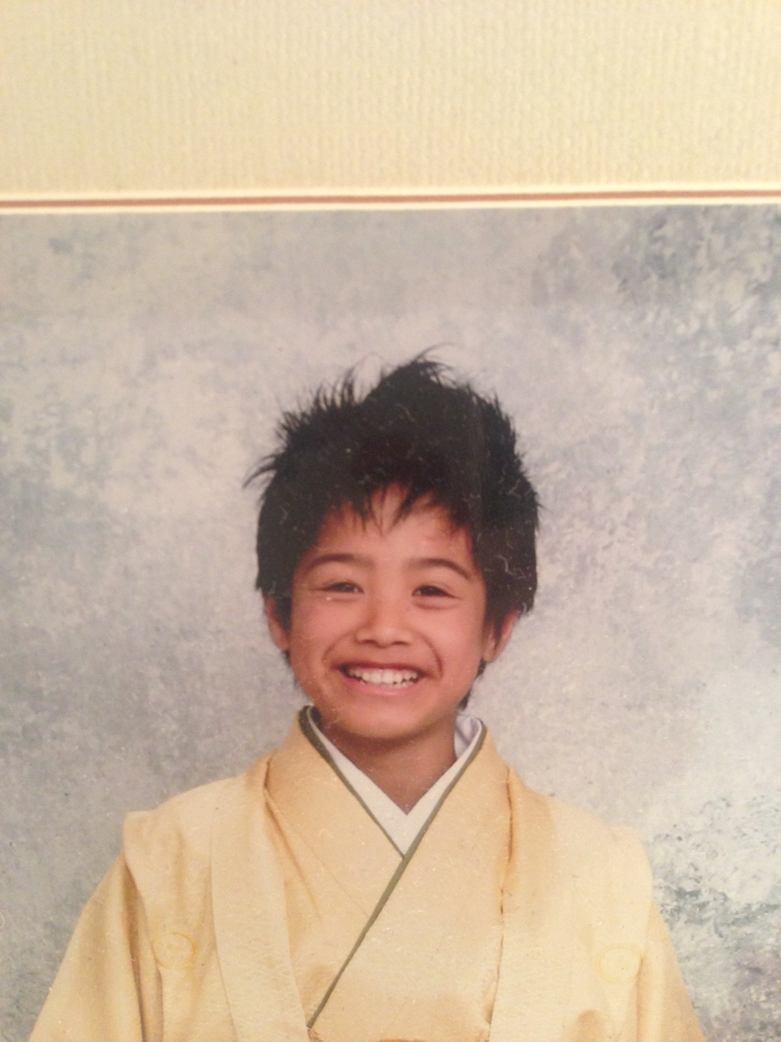上の写真は小学校の卒業式での笑顔。下はつい最近。